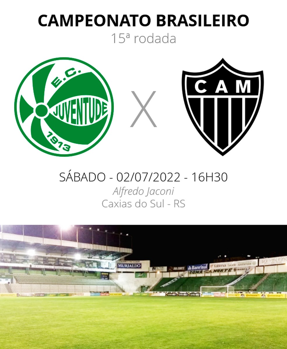 Juventude e Atlético-MG se enfrentam neste sábado, pela 15ª rodada do Campeonato Brasileiro. O duelo entre as duas equipes está marcado para às 16h30 (de Brasília), no estádio Alfredo Jaconi, em Caxias do Sul. O ge acompanha todos os lances ao vivo, com vídeos.